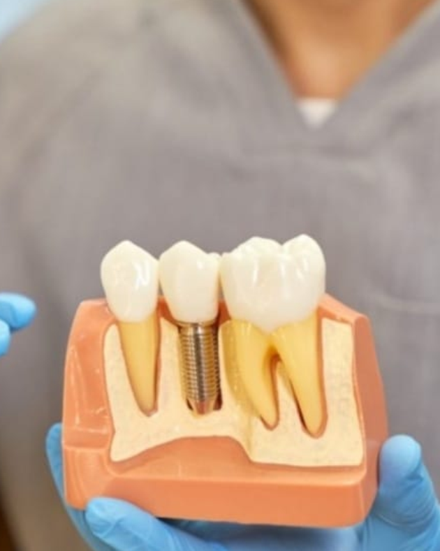 Substituição da raiz de um dente natural que foi perdido, por um parafuso de titânio fixado na maxila (região dos dentes superiores) ou na mandíbula (região dos dentes inferiores), com o objetivo de devolver um elemento dental para a região em questão. Tem por finalidade recuperar a função mastigatória, estética e fonética do elemento dental perdido, além de promover melhora da autoestima.
